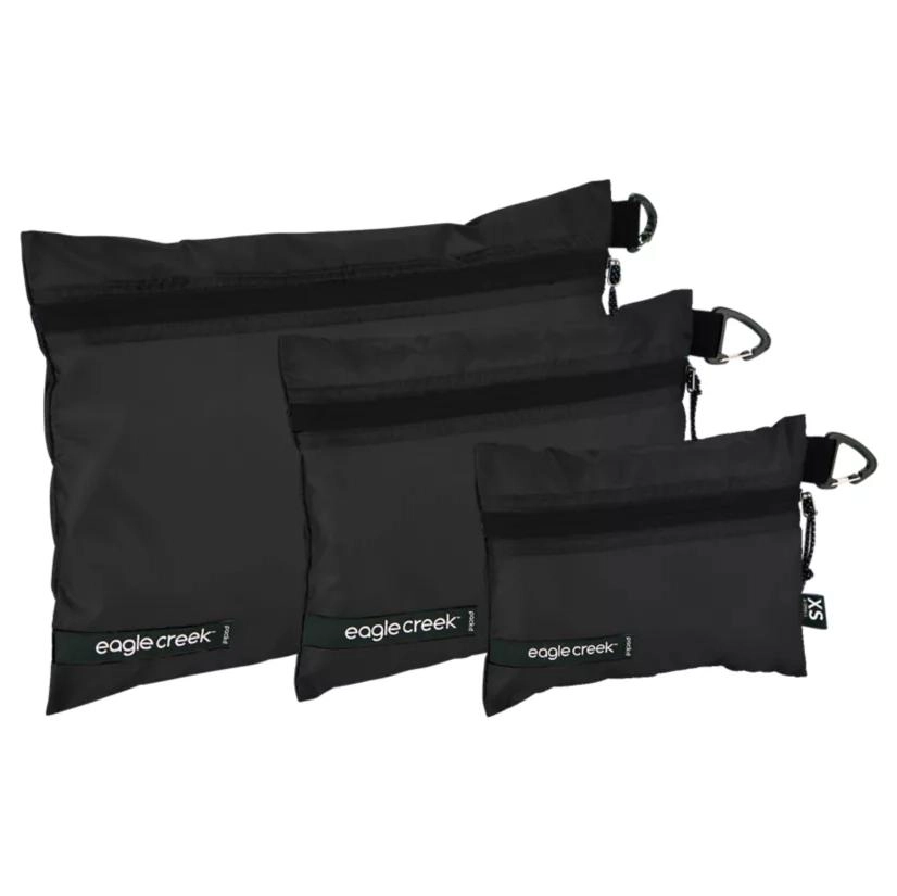 Deze driedelige set organizers voor in uw koffer of tas komt uit de Pack-Itâ„¢ serie van Eagle Creek. Deze Isolate Sac set in de maten XS, S, en M zijn speciaal ontworpen voor de fanatieke reiziger. Ze zijn voorzien van een karabijnhaak waarmee u deze in of aan uw tas kunt bevestigen. Deze set is geschikt voor bijvoorbeeld toiletitems, elektronica accessoires, of andere kleinere items die u meeneemt op reis, en ze gaan nare geurtjes tegen. Ze zijn gemaakt van een doorschijnende stof voor een snel overzicht van de inhoud. Ze zijn geschikt voor in de wasmachine, zijn waterafstotend, hebben een veerkrachtige rits, en gaan lang mee.