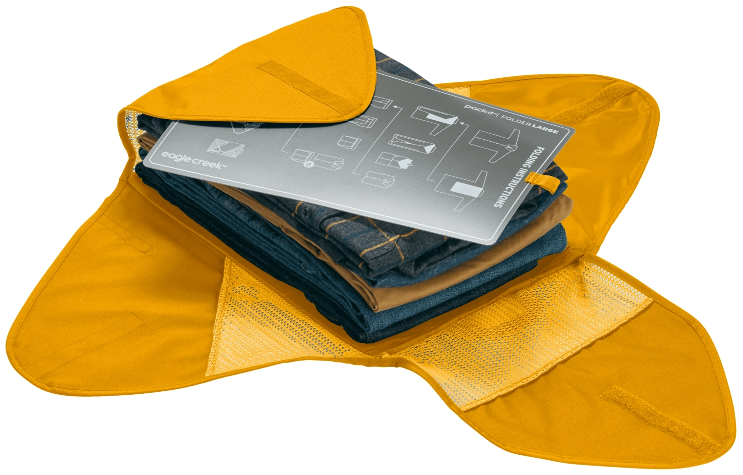Met deze handige Pack-It reistas van Eagle Creek vouwt, stapelt en bergt u kleding eenvoudig op, zonder kreukels! De organiser is gemaakt van 100% gerecycled polyester en is waterbestendig. De tas is voorzien van verstelbare mesh flappen voor maximale compressie van kleding. Hierdoor kan uw kleding ondanks dat het strak is op geborgen toch goed ademen, zodat er geen nare geurtjes ontstaan. Met de Pack-it Garment Folder van Eagle Creek blijven kreukgevoelige overhemden en broeken strak en kreukvrij na een lange reis in de auto of vliegtuig. De organiser wordt geleverd met een bijbehorend bord met instructies over de beste vouwtechnieken.