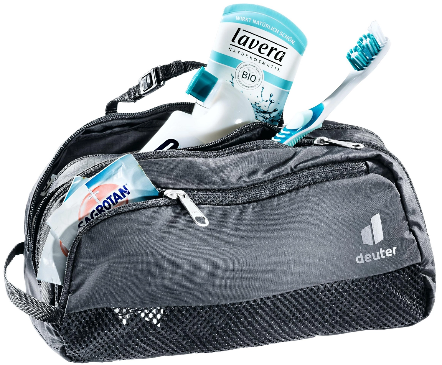 Deze toilettas van Deuter is ideaal voor avonturiers. De toilettas is namelijk ontzettend licht en eenvoudig bij u te dragen. Dit komt door de kliksluiting die op veel plekken te bevestigen is en de toilettas is ook nog eens zelfstaand door de stevige bodem. De tas heeft twee ritscompartimenten. Zo kunt u snel en eenvoudig bij uw toiletspullen en behoudt u ook het overzicht. Dit langwerpige model is eenvoudig mee te nemen en is ideaal te gebruiken in combinatie met een backpack.